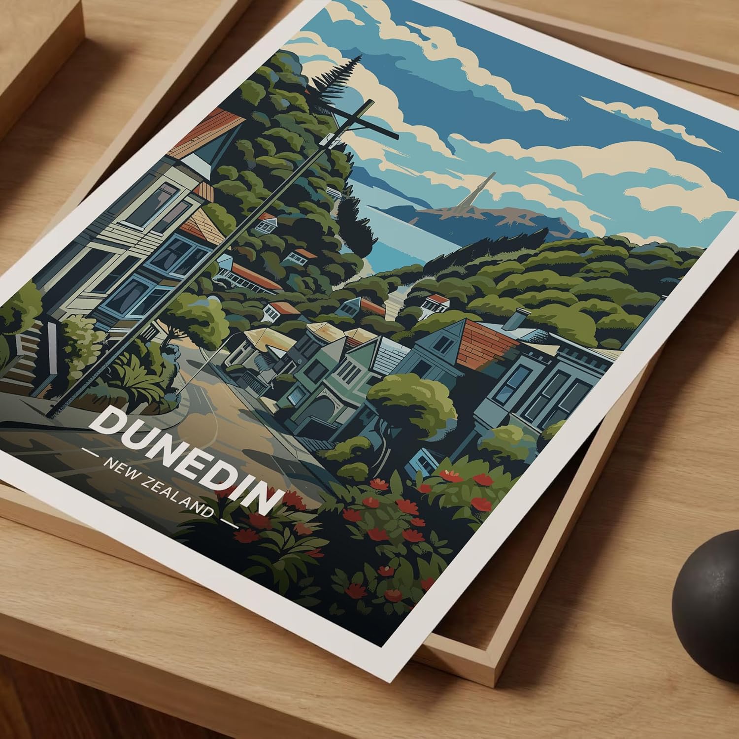 Dunedin New Zealand Travel Poster, Cityscape Art, Adventure Wall Decor, Unique Birthday or Wedding Gift